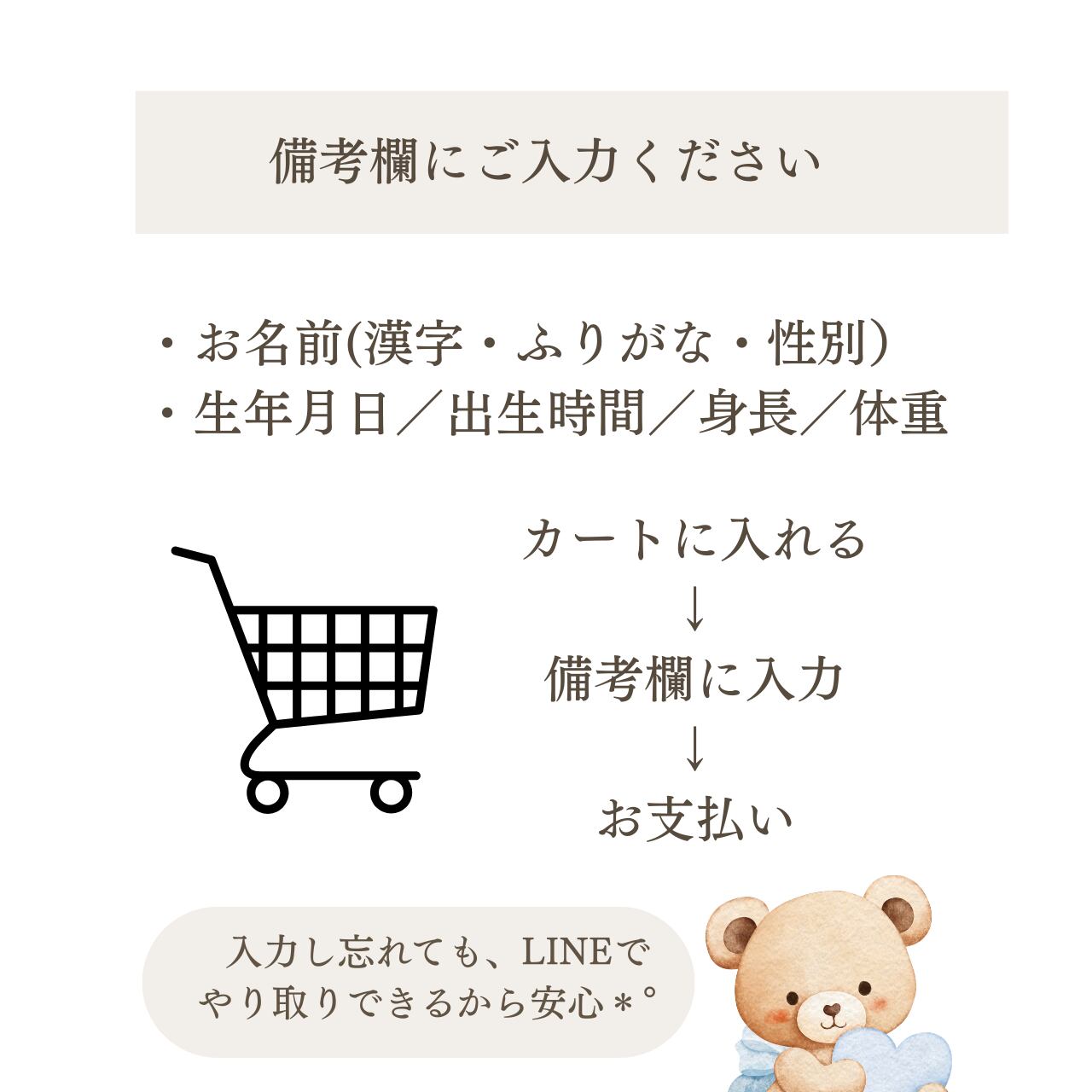 ご購入後、下記内容をお知らせください。